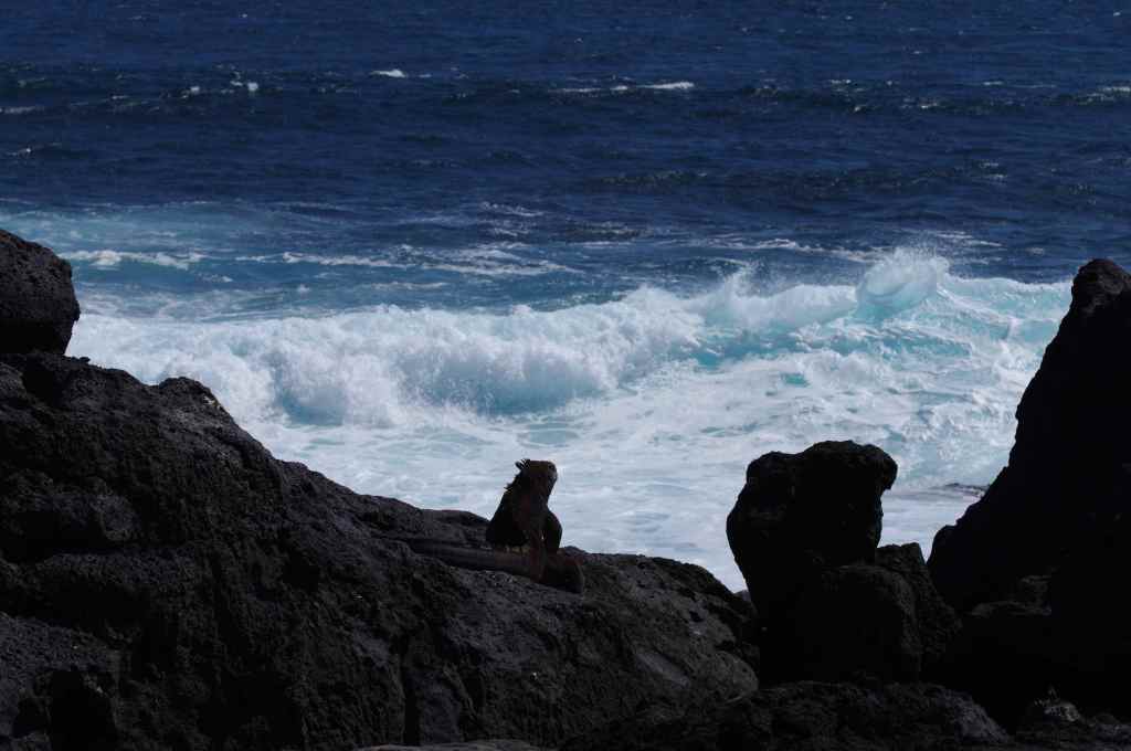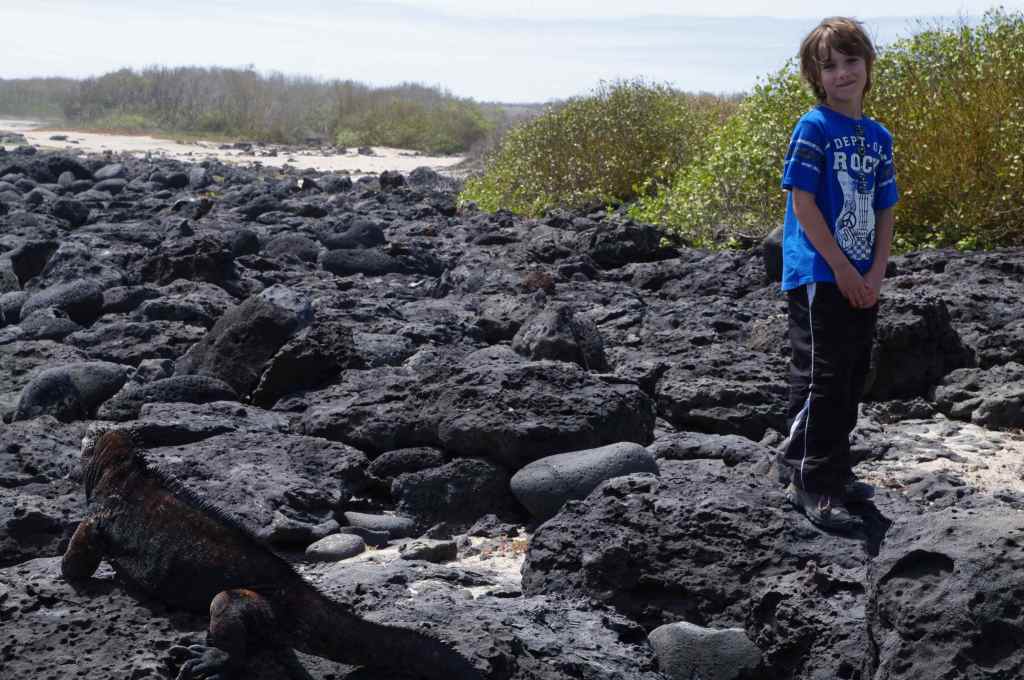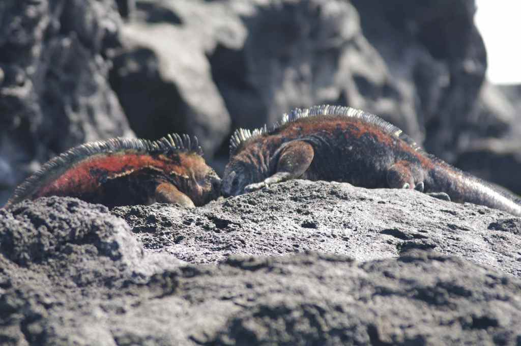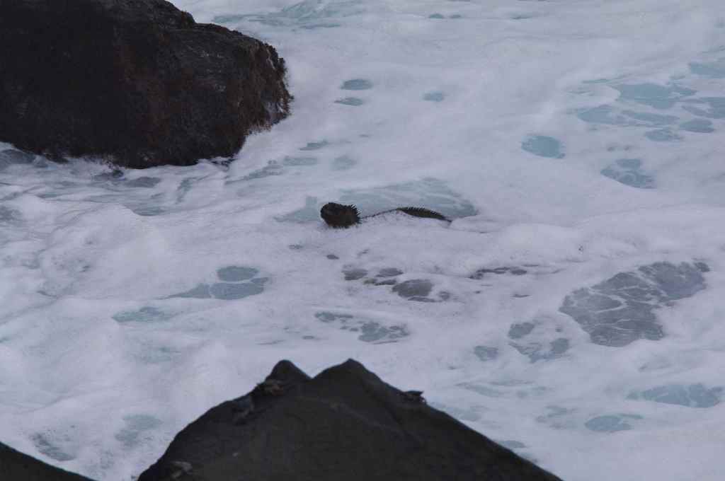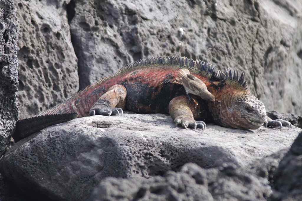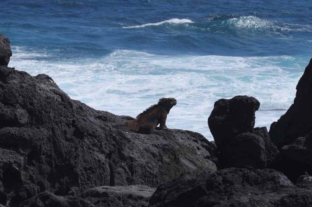 pas vu ce qui se trouvait à 20 centimètres de ses fesses….nous lui avons crié de se retourner. Ce qu’il a fait…pour bondir aussitôt! Derrière lui se trouvait un iguane marin d’un mètre 50, prêt à lui donner un bon coup de queue!